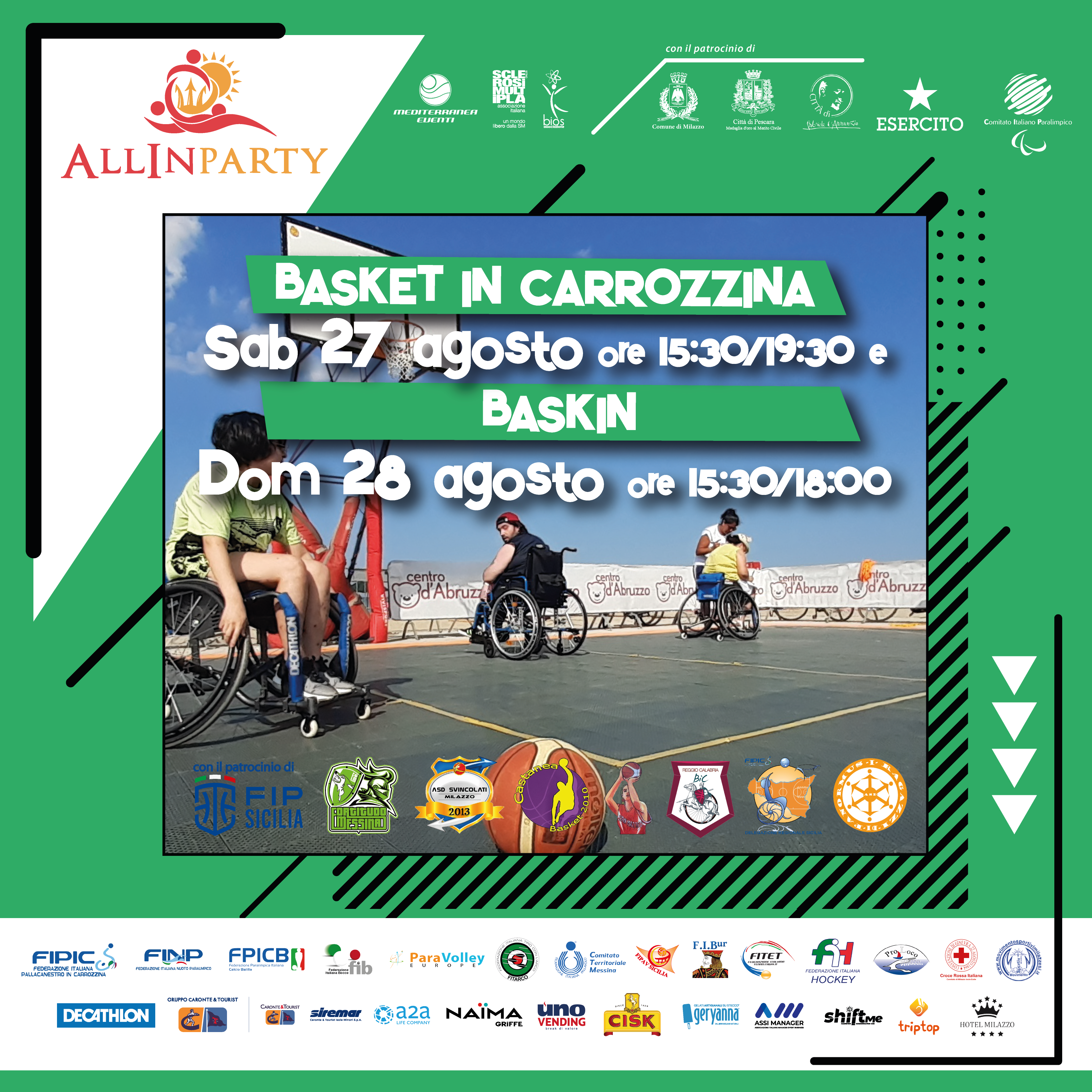 Si terrà dal 26 al 28 agosto, presso il Mediterranea Club di Milazzo (ME), la terza edizione dell’Allinparty: il festival di sport e inclusione completamente gratuito organizzato da Mediterranea Eventi, AISM e l’Associazione BIOS con il supporto di tanti partner, pubblici e privati, di tante associazioni sportive del territorio e di molte Federazioni Sportive Nazionali, paralimpiche e non, tra le quali anche il Comitato Regionale Sicilia della Federazione Italiana Pallacanestro che ha offerto il proprio supporto concedendo anche il patrocinio alla manifestazione.