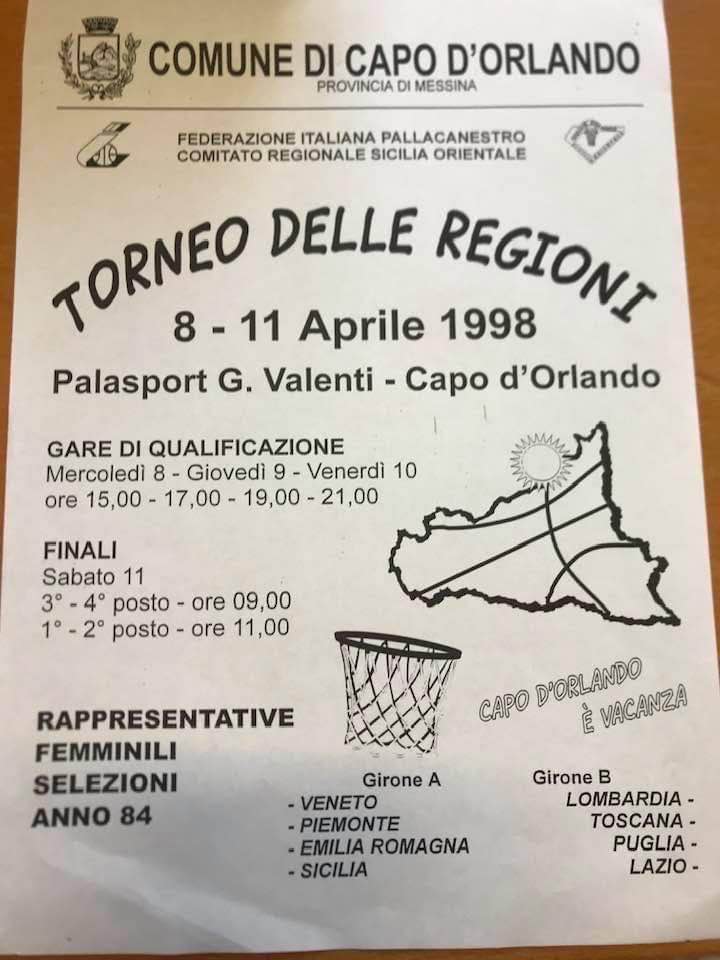 Si disputa un Torneo delle Regioni femminile, con otto selezioni regionali, al PalaValenti di Capo d’Orlando (Messina) dall’8 all’11 aprile 1998. Dopo vari raduni, anche con l’allenatore della Nazionale Riccardo Sales, questa è la squadra che viene allenata dai coach Vito Amato e Giovanni Licitra: Roberta Venturella, Valeria Salonia, Paola Tumino, Serena Maltese, Federica Fazzio, Elisa Ottaviano, Ivana Tomasello, Angela Consuelo Davì, Martha Picone, Emanuela Bonomo, Federica Di Giacomo e Stefania Arestia.